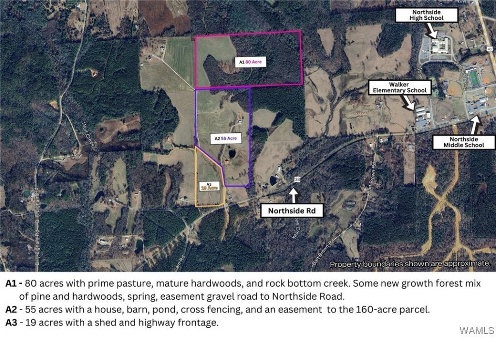 Welcome to the Whitetail Crossing tract at Barbee Creek Preserve. This tract has approximately 80 acres. It is depicted as A1 in the provided graphics. Barbee Creek Preserve is a 320± acre tract adjoining Walker Elementary, Northside Middle & High in Northport, AL. Land features rolling pastures, hardwoods, creeks, ponds & multiple barns/homes. Currently used for cattle, with options for homesites, recreation, or investment. Marketing graphics show possible parcel divisions (not final survey). Seller is flexible on parcel lines, easements, or combining tracts. Rare opportunity in a prime school zone location!